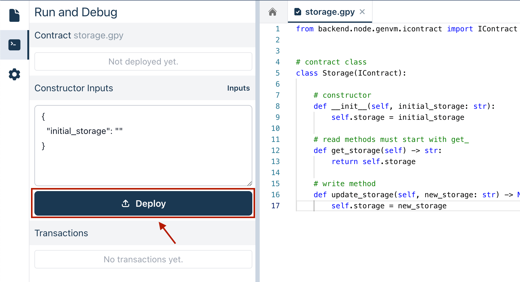 Once you have loaded your Intelligent Contract into the GenLayer Studio, the next step is to set the constructor parameters and deploy it. The constructor parameters are essential inputs that initialize the state of your contract.